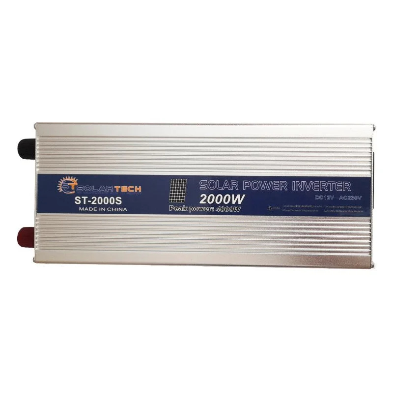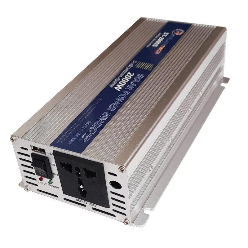اینورتر برق خودرو۲۰۰۰ وات برند سولارتک ساخت چین برای تبدیل ولتاژ 24ولت خودرو های سنگین ویا باتری ۲۴ ولت به برق شهر 220 ولت با فرکانس 50 هرتز وتوان ۲۰۰۰ وات.طراحی منحصر به فرد با بدنه آلومنیومی برای بهبود خنکسازی و افزایش راندمان، مجهز به کابل انبری باتری، مجهز به توربو فن ، مجهز به فیوز حفاظتی داخلی، دارای نشانگر LED برای نمایش حالت عملکرد اینورتر. تنظیم ولتاژ مطلوب ولتاژ خروجی در زمان تغییرات ولتاژ ورودی، مناسب برای سیستمهای روشنایی با هر نوع لامپ، سیستمهای گرمایشی، اتو، پنکه، ابزارآلات صنعتی، دریل، تلویزیونهای LCD و LED ، لپتاپ، رایانه شخصی، موبایل و تبلت. سشوار