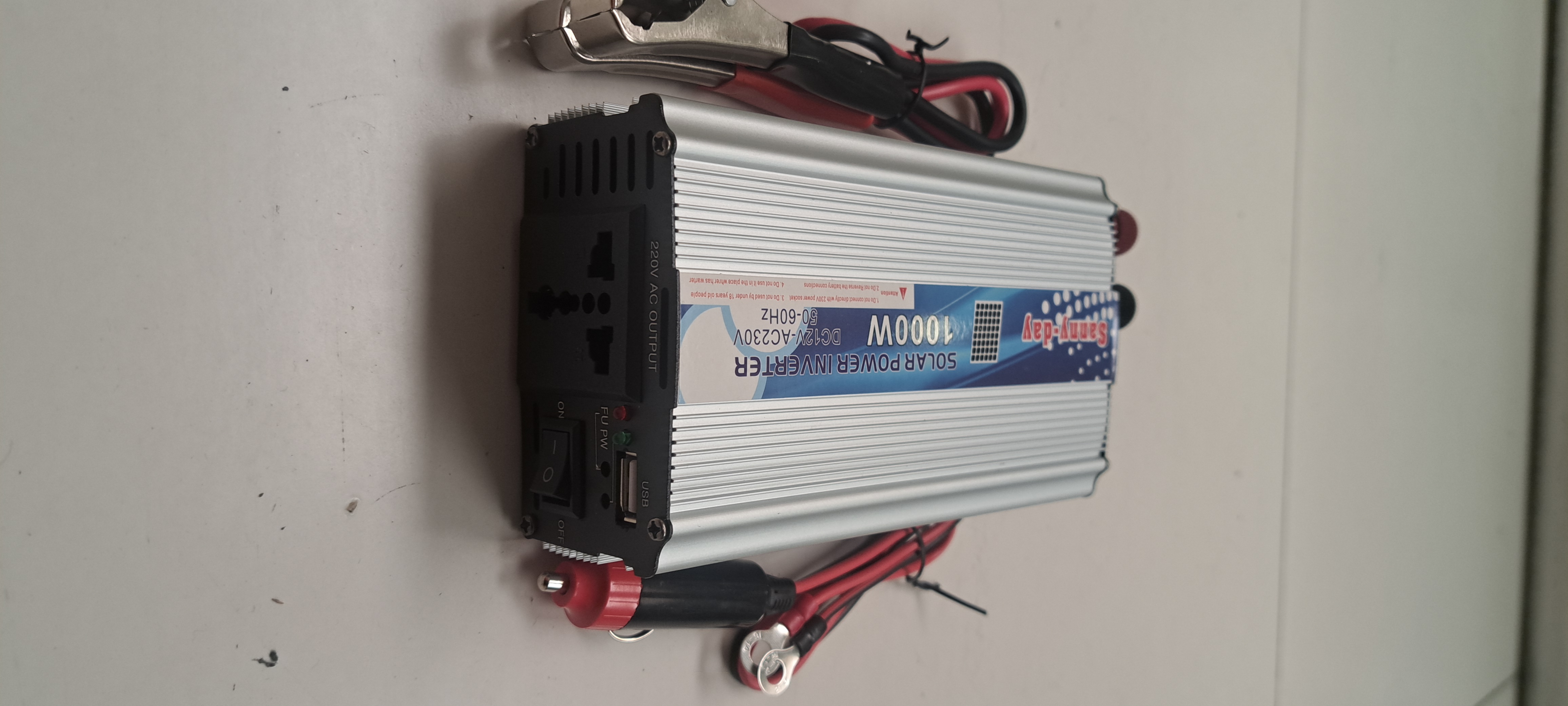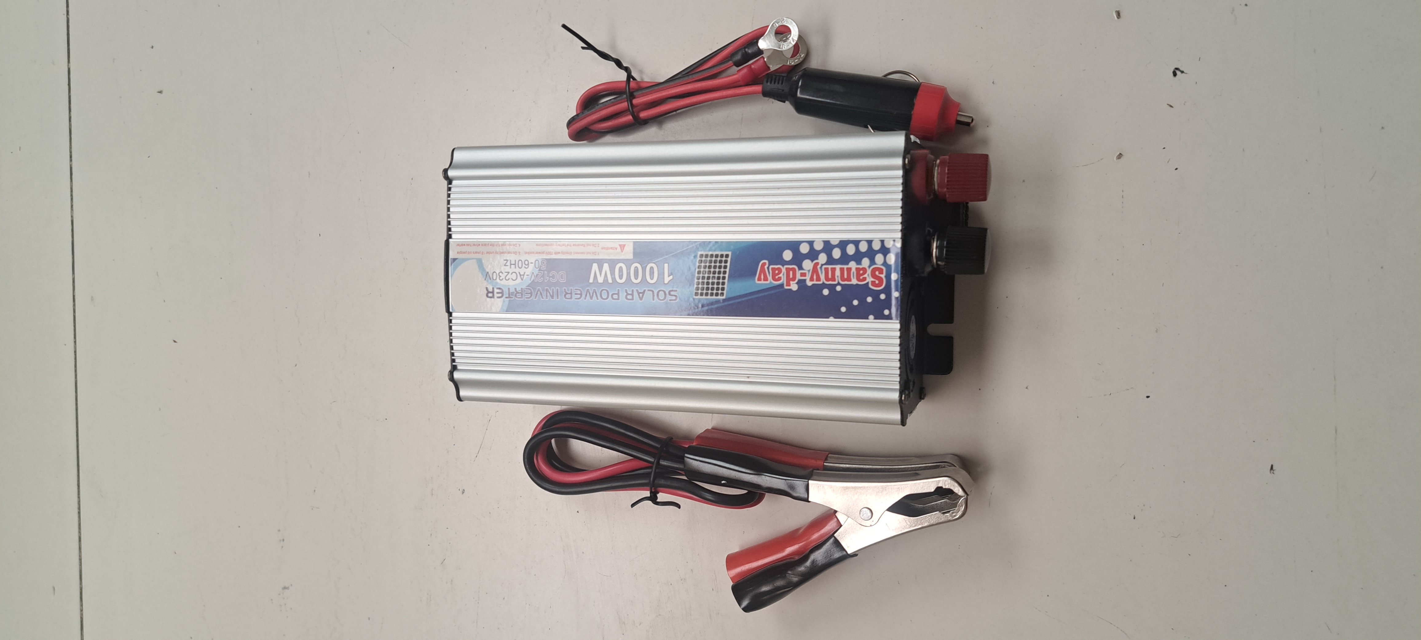 اینورتر مبدل برق خورشیدی و مبدل برق خودرو 1000وات برند معروف و ارجینال(sanny day) طرح تایوان ساخت چین برای تبدیل ولتاژ 12 ولت خودرو به برق شهر 220 ولت با فرکانس 50 هرتز است. قابلیت تامین۲۰۰۰ وات به صورت لحظهای و تامین 1000 وات در حالت استفاده دایمی. طراحی منحصر به فرد با بدنه آلومنیومی برای بهبود خنکسازی و افزایش راندمان دستگاه. مجهز به پورت USB برای شارژ موبایل و لپ تاپ با جریان خروجی 1 آمپر، مجهز به کابل انبری باتری، مجهز به کابل فندکی ، مجهز به فن توربو ، مجهز به حفاظت در برابر اضافه بار و اضافه حرارت، مجهز به حفاظت در برابر سطح ولتاژ بالا یا پایین باتری، حفاظت در برابر اتصال با پلاریته معکوس ، دارای نشانگر برای نمایش حالت عملکرد اینورتر. مناسب برای سیستمهای روشنایی با هر نوع لامپ، پنکه، ابزارآلات، تلویزیونهای LCD و LED ،لبتاپ و